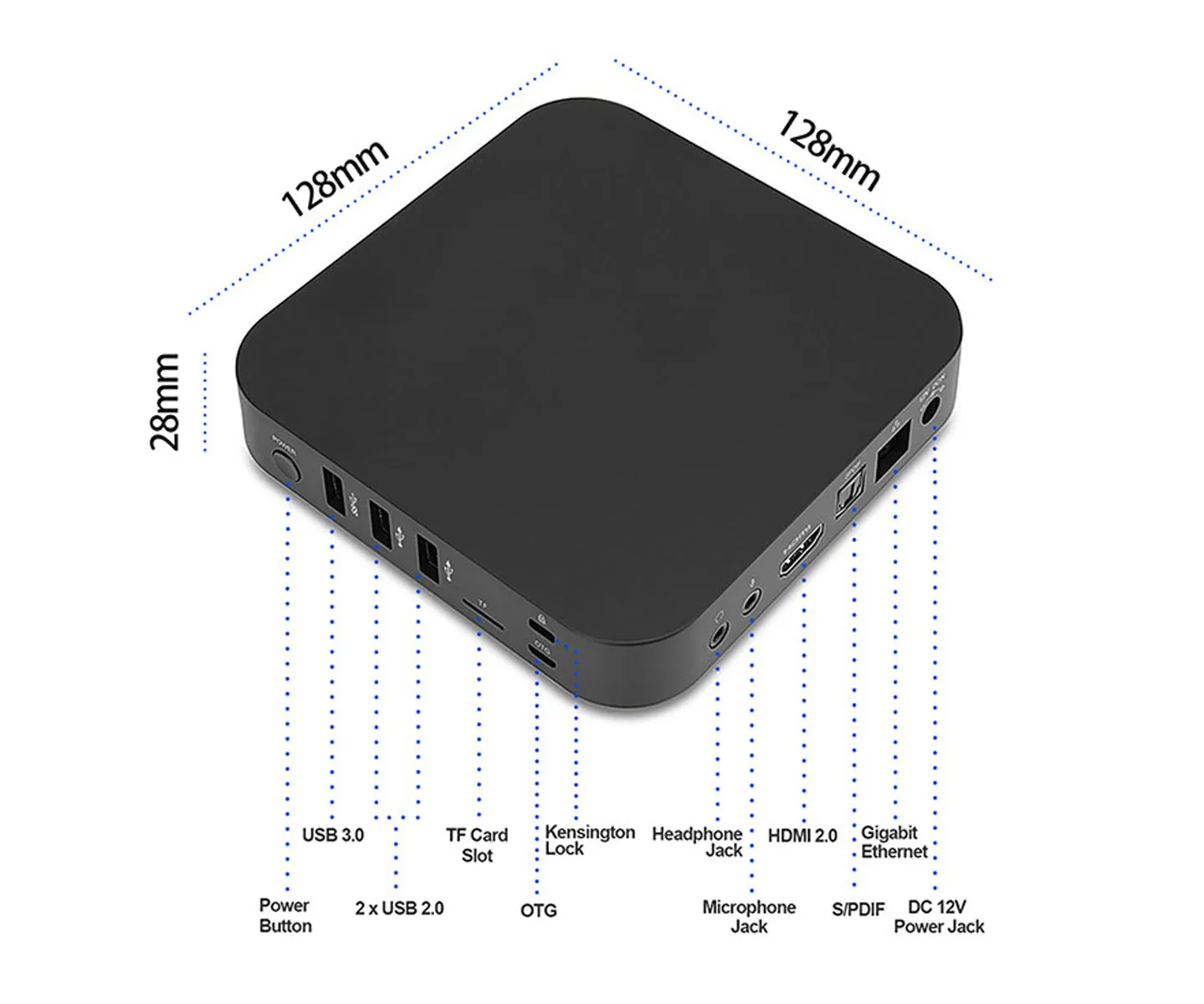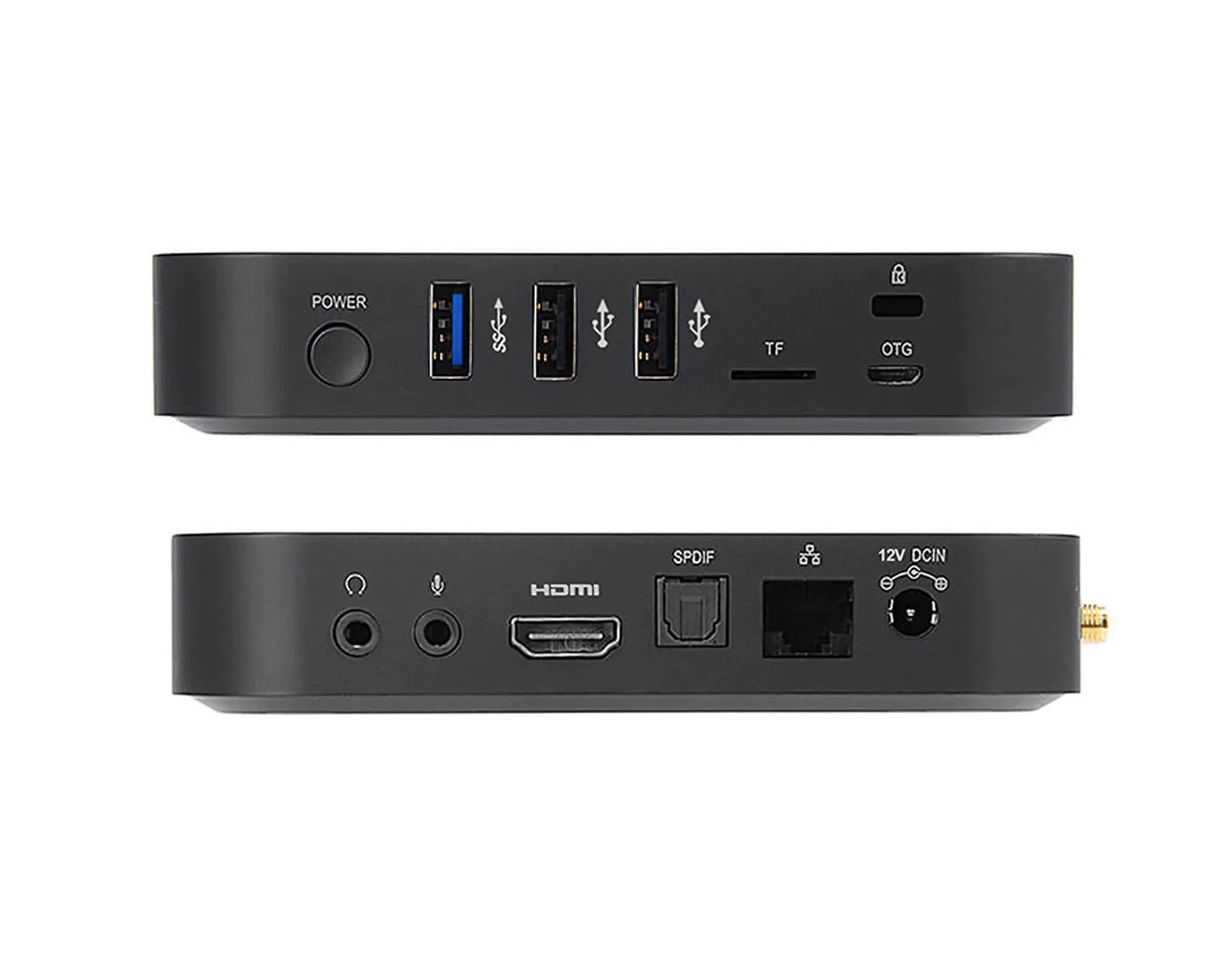 - Porty: HDMI, Ethernet (RJ-45), USB 3.0, 2× USB 2.0, DC IN 12V, slot TF (microSD), gniazdo słuchawkowe 3.5 mm, SPDIF (optyczne), gniazdo mikrofonowe 3.5 mm, OTG (micro-USB), złącze antenowe (SMA), power (przycisk zasilania)